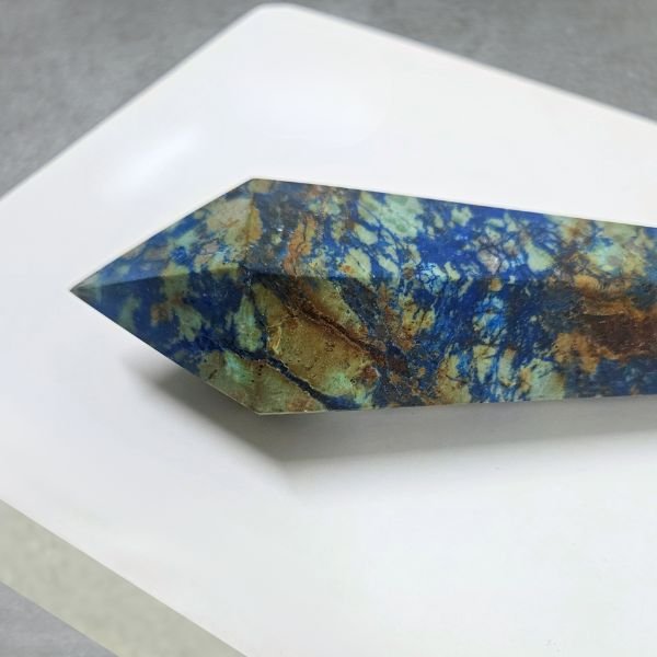 Azurite’s deep blue color, often with intricate patterns, is thought to enhance intuition and mental clarity. Historically valued as a pigment and spiritual stone, its rich tones bring depth and a sense of mystery to home decor.