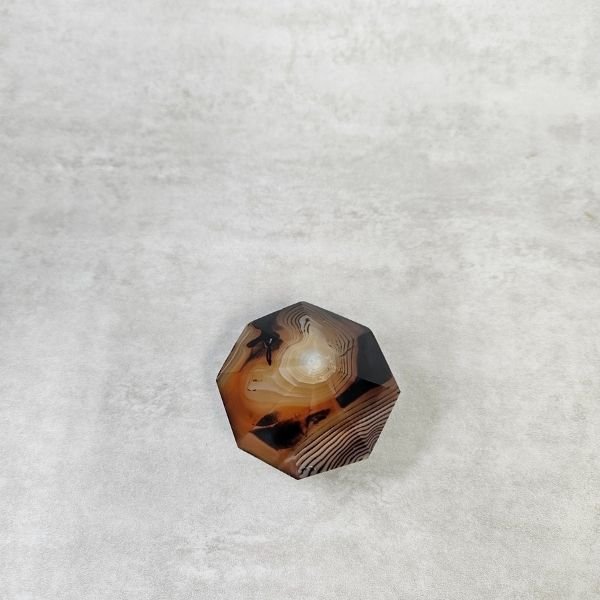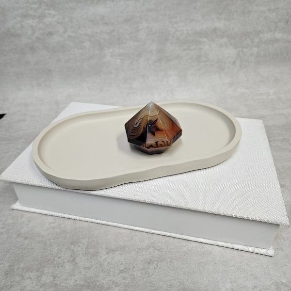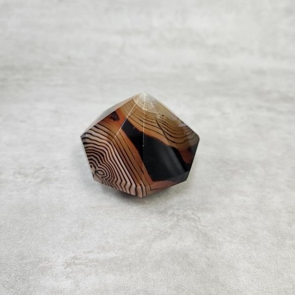 The Nala Solitaire, carved from Sardonyx with bold dark orange, Brown, and White bands, radiates strength and protection while adding striking elegance to home décor.
