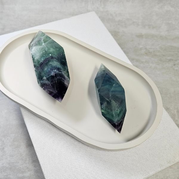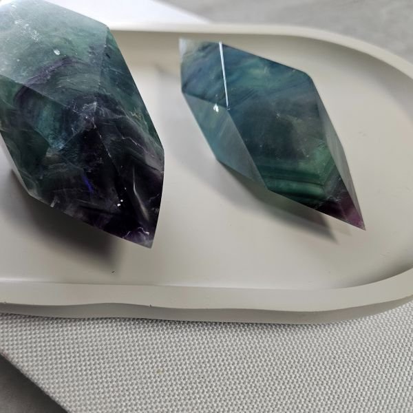 Fluorite comes in a range of colors, often in striking bands, and is known for its clarity and mental focus. Historically used in carvings, its colorful and translucent appearance brings vibrancy and clarity to home spaces.